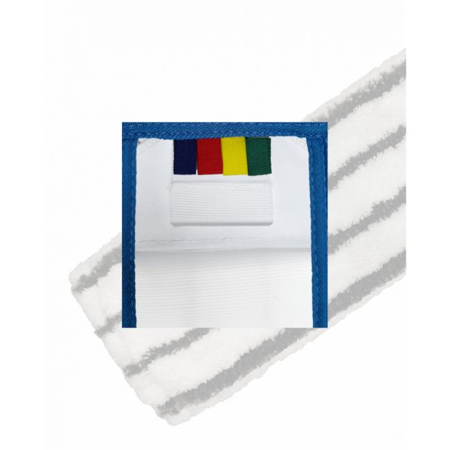 Scrub mop van zeer dichte witte microvezel (980gr/m2) die klamvochtig hardnekkige vervuiling verwijdert van alle waterbestendige oppervlakken zoals vloeren, muren en deuren.